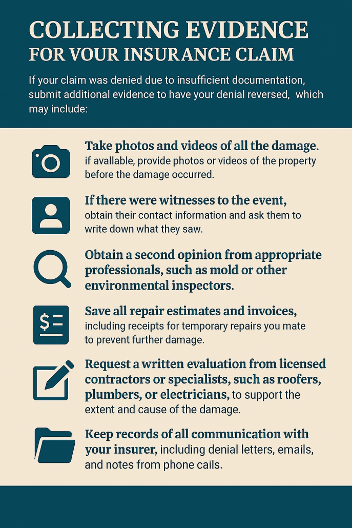 Carefully review your insurance policy, especially the declarations page, which shows the types and amounts of coverage you have for potential damages. Next, look closely at the denial letter, which explains why the insurance company rejected your claim and cites the policy language supporting that decision. If you disagree with the reason for denial, prepare to file an appeal immediately.